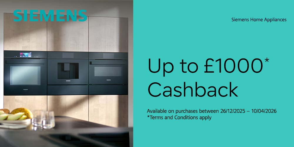 From now until the 10th April 2026, Siemens and Neff are offering up to £1,000 cashback on appliances purchases through Stadium Studios.